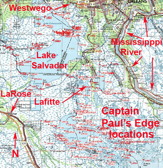 Presently, Capt. Paul’s Fishing Edge is available for 21 different areas, including Barataria Bay, Lake Borgne, Hopedale to Bayou Terre Boeufs, Delacroix to Point a la Hache, Bayou Bienvenue, Port Sulphur, Lake Pontchartrain, Lake Borgne, Calcasieu Lake, Pearl River WMA, Lafitte, Leeville East and Leeville West, Vermillion Bay, Empire-Buras, the Rigolets, MRGO, Cocodrie/Dulac, Bayou Sauvage NWR, Big Branch NWR, Myrtle Grove and Hopedale to the Mississippi Sound.
