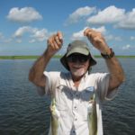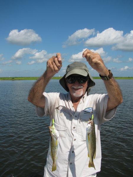 On the Breton Sound trout odyssey, Artie and Spence were too close for comfort — both were on Doc’s boat. Artie cast under the birds, as we crossed Lake Borgne, his cork plunged, and he started tussling with a hefty fish, whooping in delight.