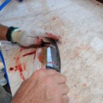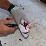 Besides the occasional use of the serrated blade on the rib cage, all cuts are made with the F. Dick Stiff blade, unless the fillet is skinned. Skinning and trimming of the red-fleshed blood line is done with the Flex blade.