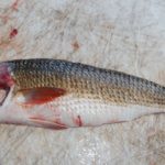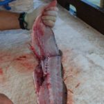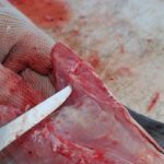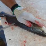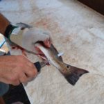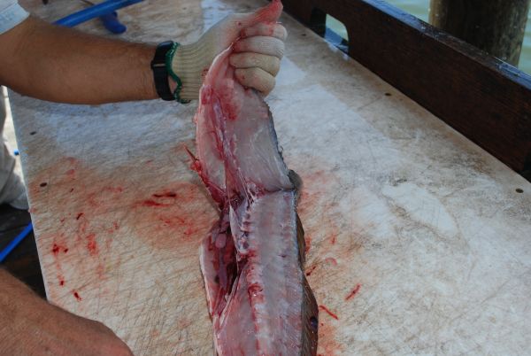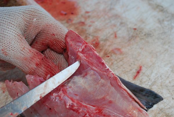 He also avoids cutting bone, such as rib cage, wherever possible. Once the flesh of the fillet has been removed from the carcass, he rips the fillet loose, breaking the bones surprisingly neatly. Once in a while, the rib bones will not break when the fillet is pulled. Any that must be cut are sliced with a Dexter Russell Tiger Edge blade.