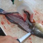 If a skinless fillet is desired, hold the tail tip of the fillet, skin side down to the cutting surface, and with the other hand cut-scrape the flesh loose from the skin. After the fillet is removed, it should be trimmed of any red flesh found on its skin side. The larger the fish is, the more important trimming becomes.