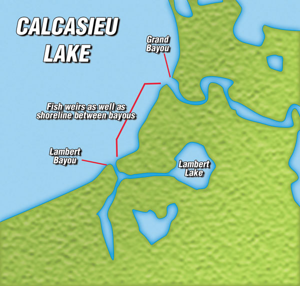 One particular stretch of shore that Poe recommended trying is the stretch between the Lambert Bayou Weir and the Grand Bayou Weir. This is a good spot to try when the water is pouring out of Lambert and running up the east bank.