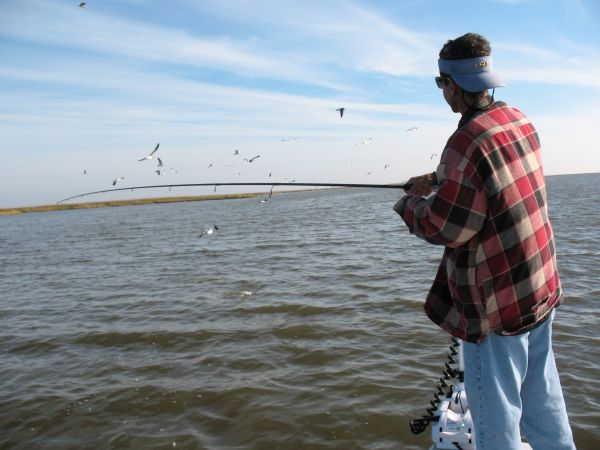 As we made our way toward our first stop, we passed a couple of nice-sized flocks of birds diving and feeding actively in Lake Mechant. I could see a hint of hesitation in Ellender’s eyes as he motored past the first flock of birds, and the temptation to stop and fish under the second flock was just too hard to resist.