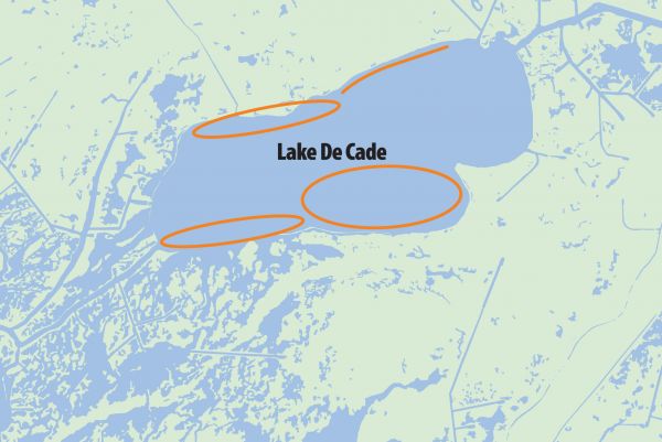 “The best-known hotspot in Lake DeCade is the southeast cove near the sunken tug boat around Christmas Tree Point,” Ellender said. “Contrary winds can make that spot unfishable, and when that happens then you’ll want to fish along the north and western banks and look for bait activity and birds.