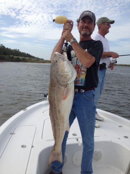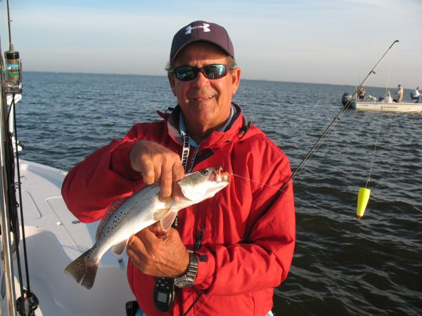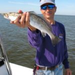 Ellender moved us around quite a bit that morning, and we caught fish every place we stopped. We caught fish under the birds and by drifting, and the hot bait of the day was a small glow/red tail Vudu shrimp fished about 2 feet under a cork tossed by my buddy, Kevin Bergeron.