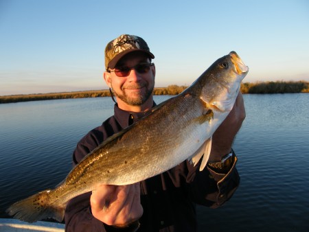 Captain Bill Lake with Bayou Guide Service (985-637-3712) didn’t get on the water until about 3:00 p.m. yesterday afternoon. Within an hour and a half, he and his customers had put 50 trout in the boat. Excited to get back this morning, he found the water had dropped 10 degrees, but that’s the way it is around DuLarge this month.