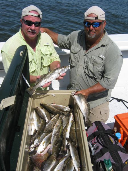 Almost everything we tossed met with success — live shrimp under a cork or on the bottom; and soft plastics in gold flake, clear, glow, black/white, avocado — and we soon had our three-man limit.