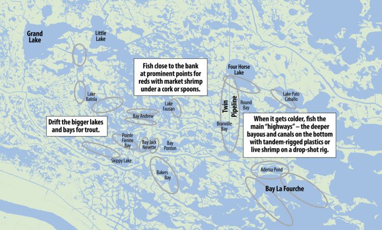 “Oak River Bay, Bay Lafourche, Pointe Fienne, Four Horse, Skippy — just drift, and as soon as somebody catches a fish stick your Cajun anchor or Power-Pole and see if more fish are in the area,” Dufrene said.