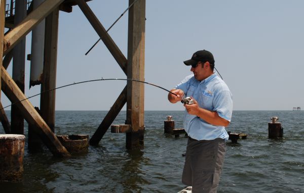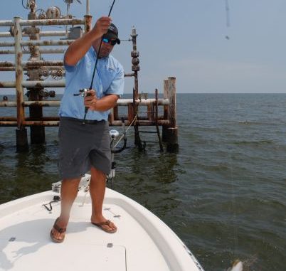 After impaling one prong of a treble hook under a shrimp’s horn, he combed the limestone shell pad around the wellhead with his bait, rather than just casting close to the well.