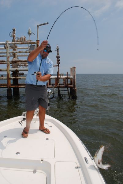 He ran farther south, outside the Chandeleur Islands and into federal waters — Breton Sound Block 53-A to be exact. At this complex of three big rigs, Carter tied off to start fishing rather than use his trolling motor.