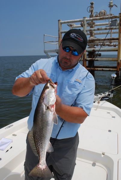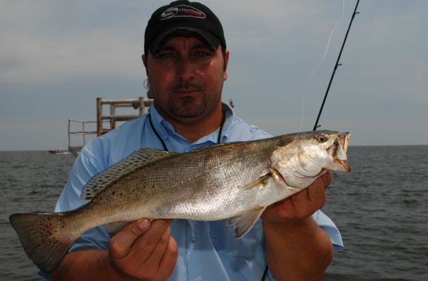 After catching several of the pests, however, he slammed the hook home and a speckled trout came thrashing to the surface — a good one about 4 pounds.