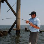 Riding his trolling motor the whole time, he kept close enough to the platform to pitch in to almost any point. While he fished, he provided more coaching about fishing successfully on wimp tides.