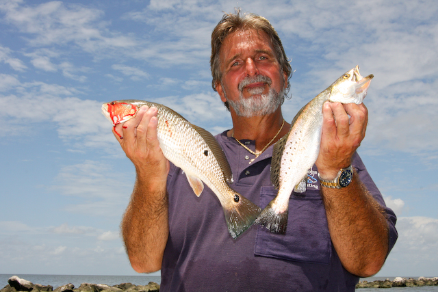 Four boats crowded around a single piling jutting above the rocks forced Captain Ron Hope and I to keep looking for a spot. Finally, we found it, a blow-through on the long rocks where trout, reds, black drum and sheepshead were ganged up to eat bait washing through the rocks.