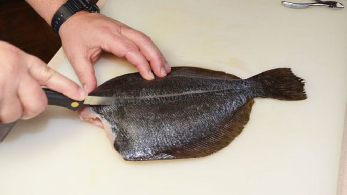 1.) After de-heading and gutting the flounder, make a cut to the backbone the length of the fish down the center line of the dark side of the fish.