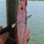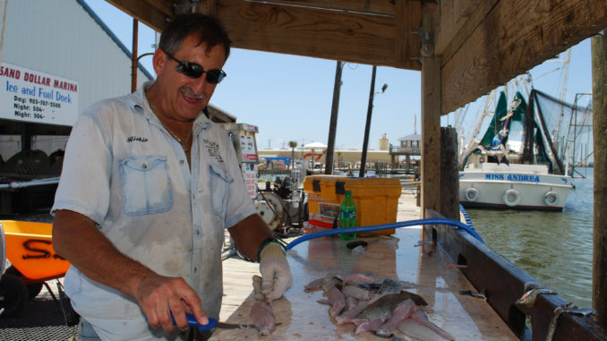 Before filleting the fish, he cuts loose the egg sacs and sets them aside, either to give to the customer, or more likely for friends — “old people” in the Grand Isle community.
