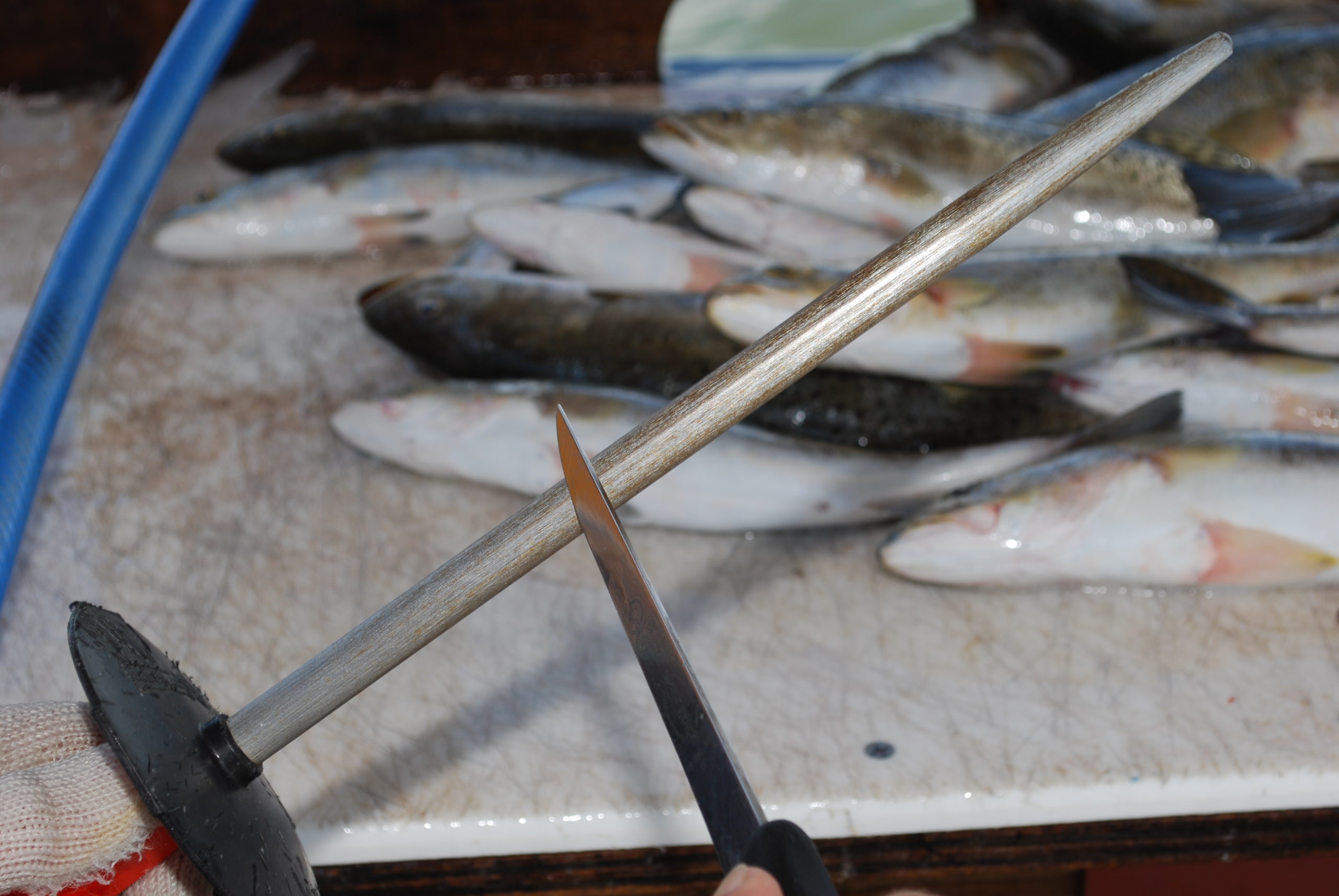 “I was working at a table that faced away from the water. While I was cleaning the fish, the knife slipped through a fish and slime and guts hit a woman nearby.