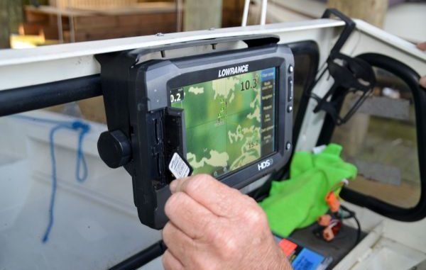 The SD cards, as well as Standard Mapping Services hard maps, are available at tackle stores, marinas, electronics outlets, and boat dealers.
