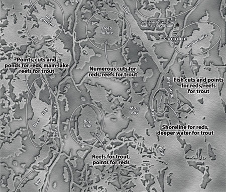 Bay Sale, Deep Saline, Deer Bay and Mangrove Bay often offer plenty of hard bottom to attract feeding trout.