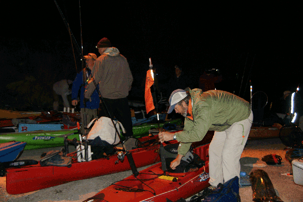 After checking in and getting their lures, kayaks will be launched and bunched up in a holding area, awaiting the group start at 5:30 a.m. (“blast-off” would be an oxymoron)