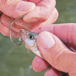Both also used Carolina rigs, an 18-inch 30-pound-test monofilament leader with the hook on one end and a small swivel on the other. Above the swivel, they threaded a ¼-ounce egg sinker on their 12-pound-test line. Bourgeois noted that he, on occasion, uses sinkers as large as ½-ounce, but he prefers the smaller ones because they don’t dig into oyster shells as much.