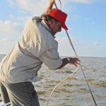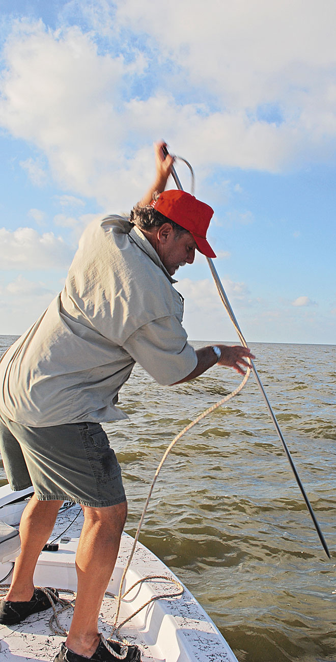 Here, instead of a Danforth anchor, Bourgeois opted to use his Cajun Anchor. The deep water made the task difficult, and when he hurled it into the water, he looked for all the world like Moby Dick’s Queequeg, the chief harpooner of the Pequod, targeting a sperm whale.