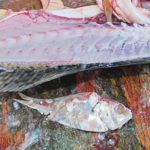 Bourgeois guided the boat south from Lafitte-Barataria. First stop was what he identified as Perrin’s Point in Redfish Bayou. All that marked the spot were two old pilings from what apparently was an old shrimp-drying platform. Bourgeois impaled a shrimp on his hook, and Bonano pushed a kahle hook through the jaws of a cocaho.