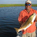 We caught several nice reds in that one spot before the action played out. Kieff moved us about 50 yards down the shoreline, and we tried again. Once again, within 10 minutes or so we got nailed by hungry reds and added a few more to our collection. We followed that same procedure over the course of the morning — moving, sticking, fishing. At a few places we caught nothing. But at others we caught reds and even the occasional trout.