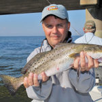 Both men immediately hooked up — Weiss to a modest-sized trout, Trahant to a reef ball. While Trahant re-rigged another Carolina rig, Weiss caught two more specks. On Trahant’s second cast, the result was the same. He caught a reef ball, and Weiss caught another trout.