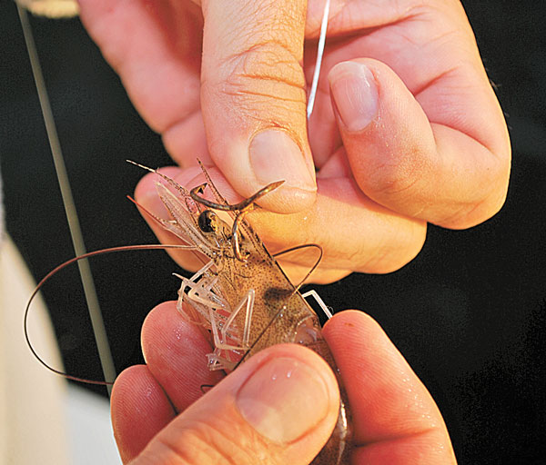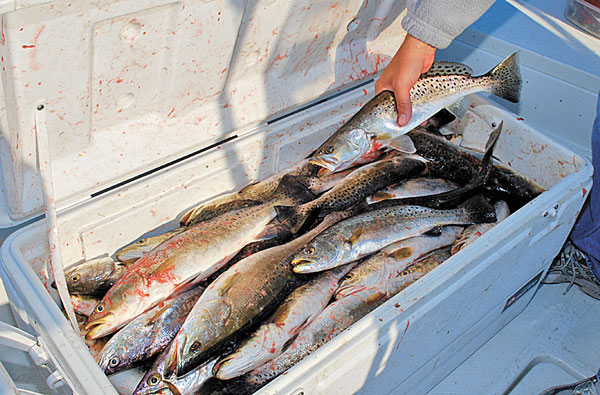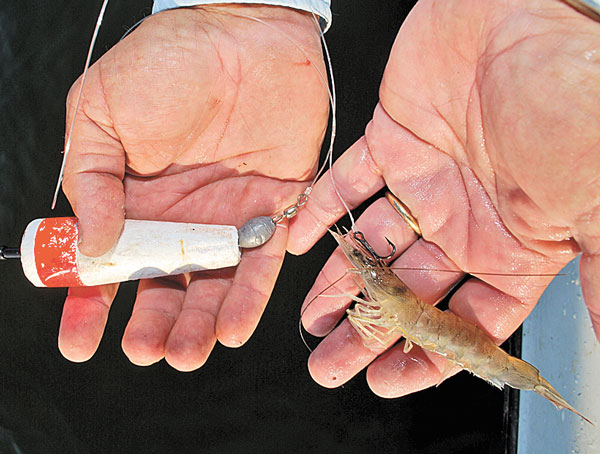 Weiss slipped on a sliding cork set at 9 feet, while Trahant used a Carolina rig. Each used a No. 6 treble hook. The “little bitty treble hook,” said Weiss, allows a shrimp to swim naturally and it doesn’t let the trout throw the hook.