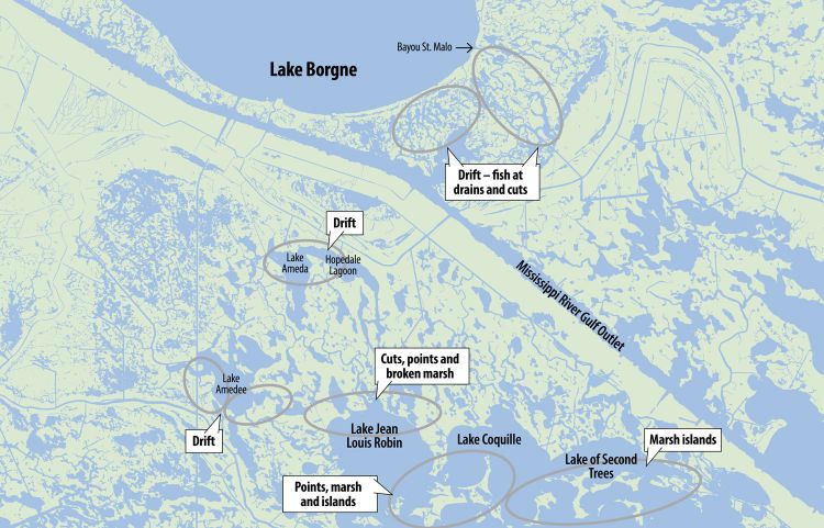 “On mild days I’ll start in the bigger interior bays and lagoons, just drifting and fan casting on all sides of the boat,” he explained. “Lake Ameda, Hopedale Lagoon, Lena, Lake Amedee, Tanasia — all have been producing fish.