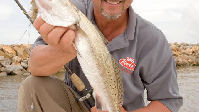 School trout were seemingly everywhere we went, and if they were there they almost immediately began pulling down our pearl white 3-inch Berkley Gulp! Alive! Swimming Mullets. We got in them pretty thick in Athanasio and found trout scattered along the long rocks and in the new cut.
