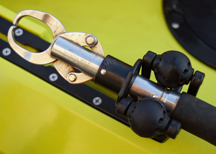 The base mount utilizes a T-bolt screw that is compatible with RAM Tough-Track and most kayak track systems. The base is easily tightened by hand and can be set at various angles, not just parallel to the kayak. This is especially handy for holding landing nets or gaffs at just the right position for quick and easy access. A spring-loaded plunger between the roller balls assures that there are always three points of tension for a secure hold. Another handy use is to hold your BogaGrip, or similar lip-grip tool, at the ready. And a molded-in eye at the base of the Roller Ball provides a secure location to clip a gear leash. Stake out poles, bait nets and many other items can be securely held in place with the RAM Roller Ball. MSRP: $17.99.