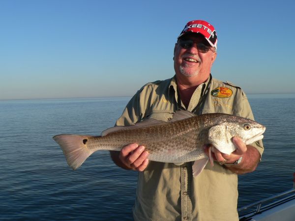 Langridge said if we were specifically targeting redfish, he’d troll along the shoreline close enough for a long cast to reach the bank, and we’d toss spinner baits (he likes a No. 4 Colorado-bladed spinner and a black/chartreuse H&H cocohoe); gold spoons (he says the Johnson Sprite is hard to beat); shallow-running crank baits like the Baby 1 Minus (the downside is the treble hooks tend to snag in the cane stubble), and the No. 1 redfish bait — live shrimp or market shrimp.