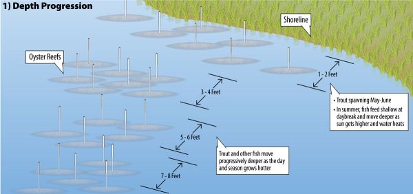 Montet said trout spawn over shallow oysters in 1 to 2 feet of water during May and June.