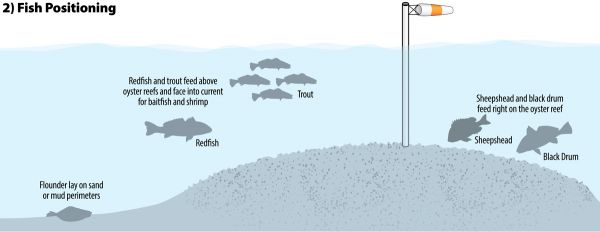 Redfish and trout typically patrol above and around the reefs in search of tide-born shrimp and baitfish.