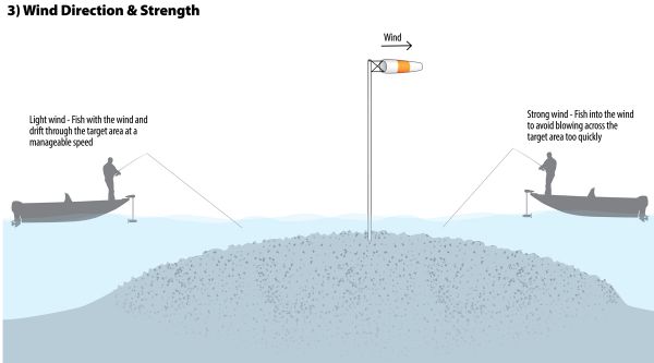 He’ll keep a light to moderate breeze at his back for a steady, silent drift. But if the wind pushes him too fast for efficient presentations, he’ll head into it and use his trolling motor to balance the blow and hold his boat on the spot.