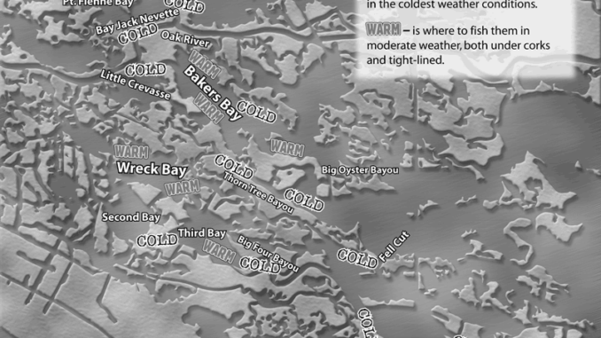 “But it never stays real cold down here for very long. Once the weather begins to warm things up, you’ll want to look for the fish in these larger bays. Baker’s Bay, Wreck Bay, Third Bay, and if it stays warm for a while, Bay Lafourche will also turn on.