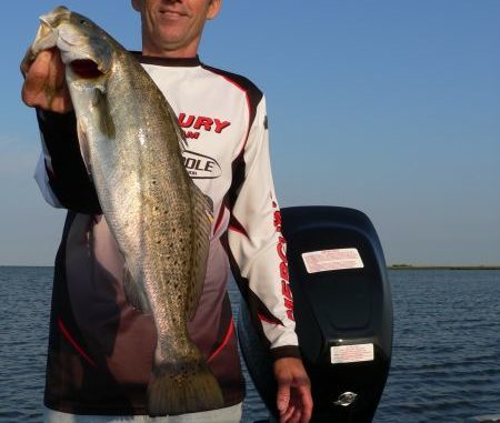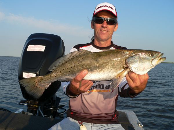 I’d set up a trip with Capt. T-Man Cheramie (985-677-6294), to make hit the big, open water where the trout were reputed to be large, thick and absolutely carnivorous. We met at daybreak at Basson’s Boat Launch, loaded our gear aboard his 22-foot Predator Bay boat and headed for Raccourci.