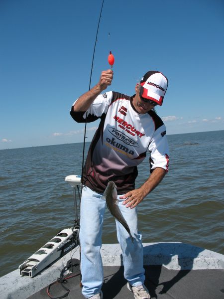 Cheramie had a MirrOlure Top Pup in a green/white-belly mullet color, while I went with a solid bone-colored She Dog. My brother, Tony, also aboard, was casting a glow DOA shrimp under a cork.