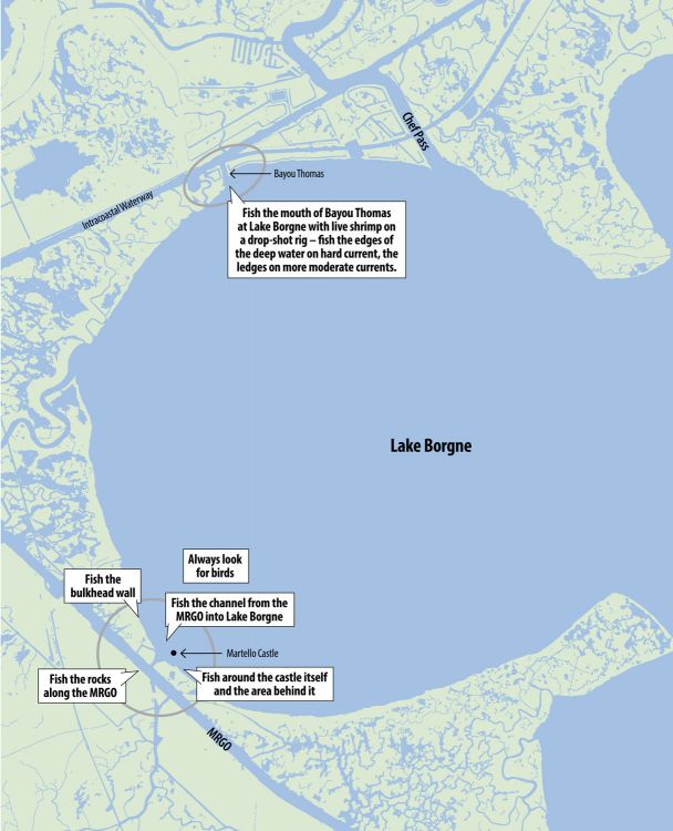 “Just don’t think that you have to focus all your attention right around the Castle,” Gallo said. “Fish the bulkhead, fish both sides of the channel, fish off behind the Castle and fish the rocks right up there along the MRGO. I pull some beautiful trout off those rocks sometimes.