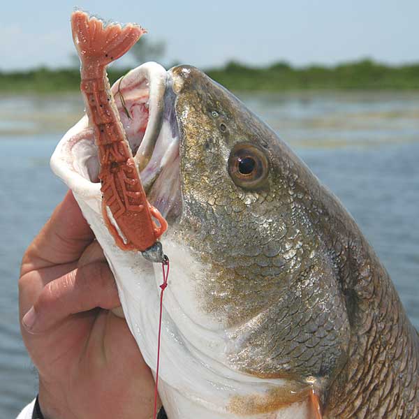 Tournament teams know that reds don’t always connect on topwater strikes, but a fish that misses will usually grab the first subsurface target it sees. Clacking corks with jigs, soft jerkbaits or Berkley Gulp! Shrimp will help attract attention when abundant natural forage occupies the fish’s attention. Spring redfish eat a lot of peeler crabs (molting blue crabs), so soft-plastic crab bodies on ¼-ounce jigheads or weighted hooks will also produce.