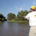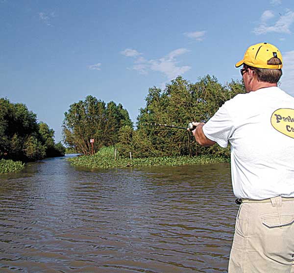 When the freshwater diversion project releases river water — mostly in the spring — Swett avoids muddy conditions by leaving the main canals and bayous and heading into backwater ponds where coontail and hydrilla further filter the water. In this tidal system, daily flushing keeps the oxygen content freshened, but it’s best to avoid the choked and stagnant water of dead-end canals or sloughs during the summer months.