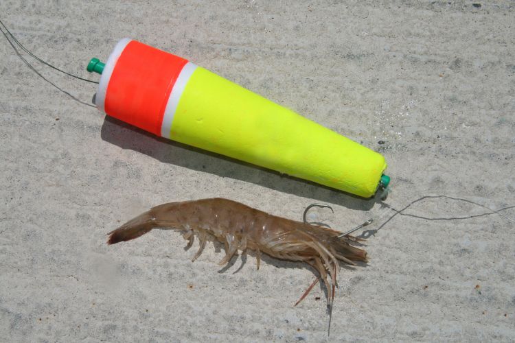 Below the cork, Obiol likes a standard 18-inch leader of 30-pound fluorocarbon. Those jigs and synthetic shrimp are usually heavy enough to straighten out the leader on your cast and pull it straight after the pop. For natural baits, especially lighter shrimp, a split shot about 6 inches above the hook will help.