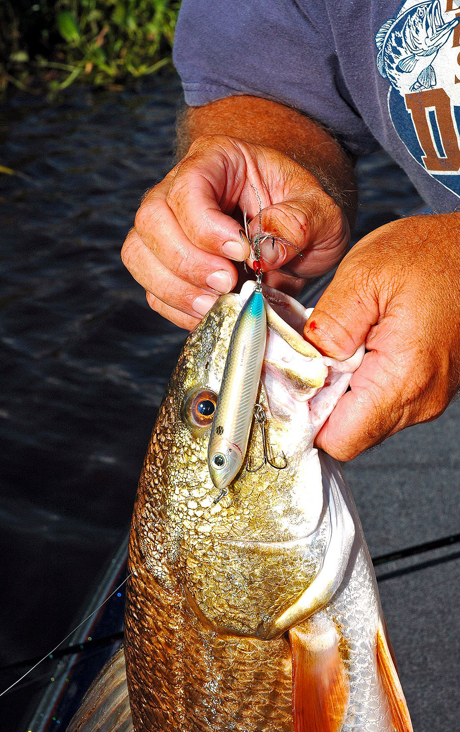 “We like to sight-fish for reds and throw topwaters at them,” Broussard said. “When it’s calm, we go down the shorelines very slowly looking for any type of wave. With good, polarized sunglasses, we can see fish. If we see a redfish, we can catch it. We throw the bait three or four feet in front of it and barely twitch it because we don’t want to scare it. Make really subtle movements so the lure looks like a wounded minnow. When a redfish takes an interest, it goes beneath the bait and watches it.”