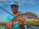 The early bite on the southwest side of Bayou Lery was on soft swimbaits and topwater. Bass and reds were staged up on a single grass-covered point. By 7:30 we had several keepers and a lone flounder. Whooper Poppers and green cocahoe with a chartreuse tail on a quarter (1/4) ounce lead head did the trick.