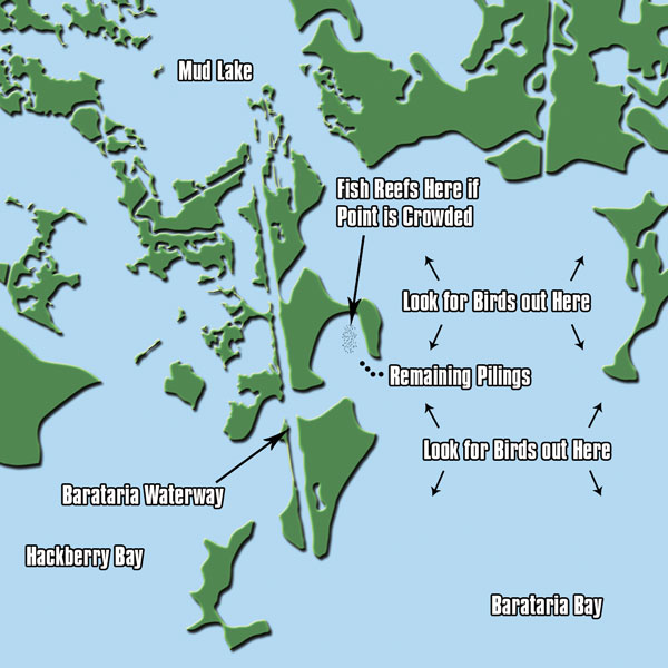 Take into consideration that the bottom in the Manila Village area is only 1 to 2 feet deep as compared to the 8- to 10-foot depths of Barataria Bay, and you can see that the current lines become even better defined. It’s no wonder the area is such a popular spot.