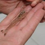 Shrimp are hooked by impaling a #2 kahle hook under the horn on top of the head. Although he dispenses with it in shallow water and under calm conditions, most of the time he clamps a medium-sized split shot on the line 8 inches above the hook to keep the shrimp from swimming to the surface.