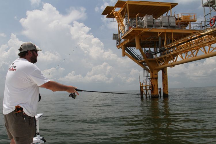 Expect the fish to loosely roam a rig’s structure and perimeter during slower tidal periods, but they’ll pull tight to the legs when the current increases.