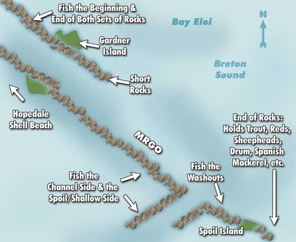 The Cut is a channel about halfway down the long rocks, leading away from the Bay Eloi side over toward the Delacroix side. Brechtel says there is usually a lot of current pushing through the Cut, making it an unlikely place to catch specks except on days with little tide. But it is an excellent spot to catch reds, and anglers can also fish the shallow sides of the Cut under a popping cork for specks and scattered reds.