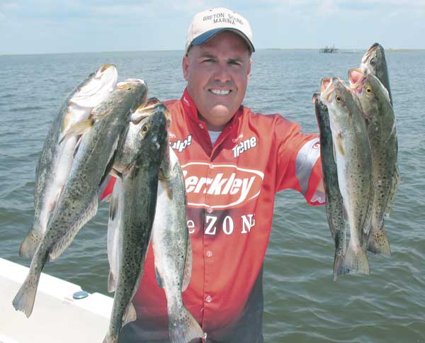 Speckled trout are plentiful all along both sides of the jetties, and redfish, sheepshead and big croakers aren’t in short supply either. I have to admit a certain reluctance in even writing this, because the area is where I’ve been fishing, and there’s already plenty of company out there.Almost every trip I’ve made this summer has been to the rocks, unless I was fishing in someone else’s boat. Sometimes I also venture out to the rigs in Bay Eloi or if I want bigger fish I’ll head to the more-distant rigs in Breton Sound, but I usually wind up, either on my way out or the way in, at the rocks.